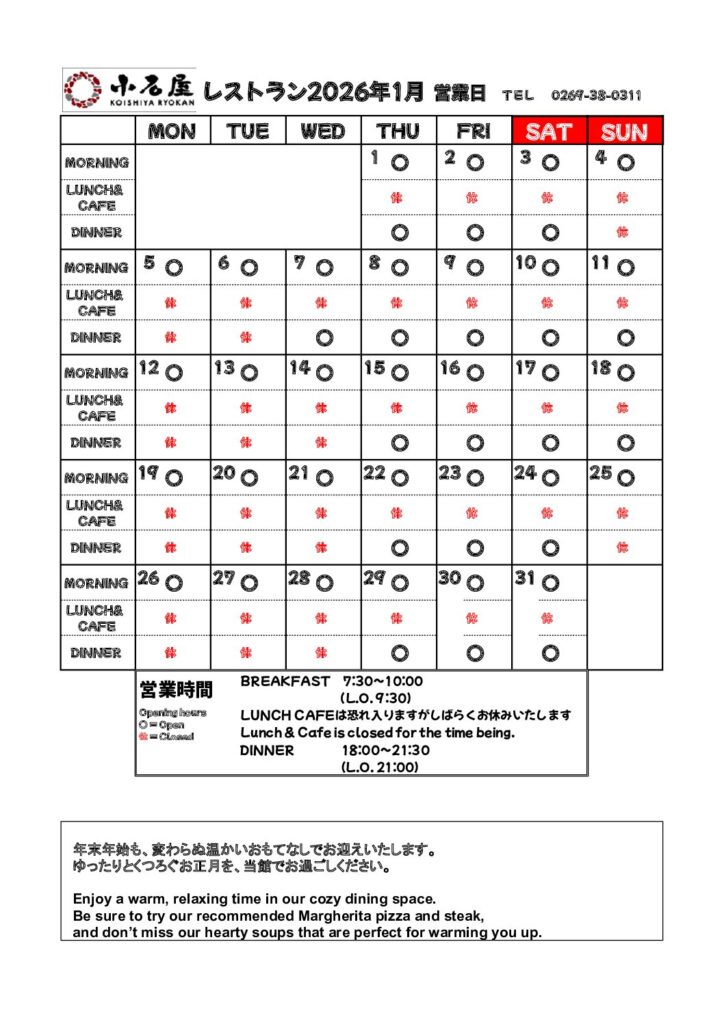 いつも小石屋旅館ならびに小石屋旅館カフェ&レストランをご利用いただき誠にありがとうございます。