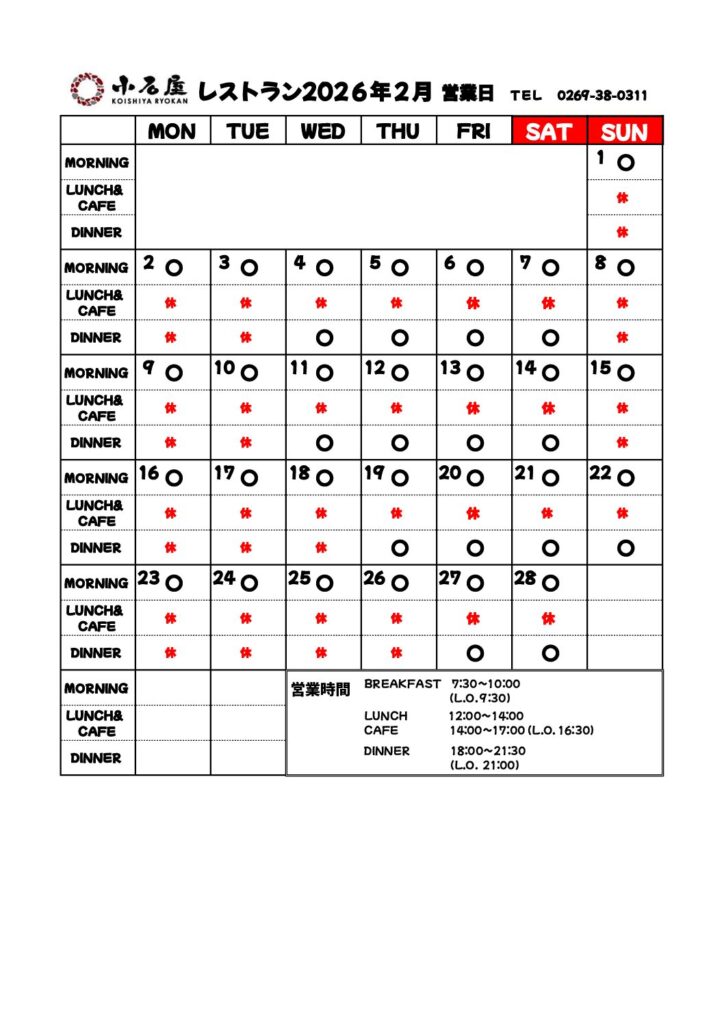 【カフェ&レストラン営業予定】2026年2月